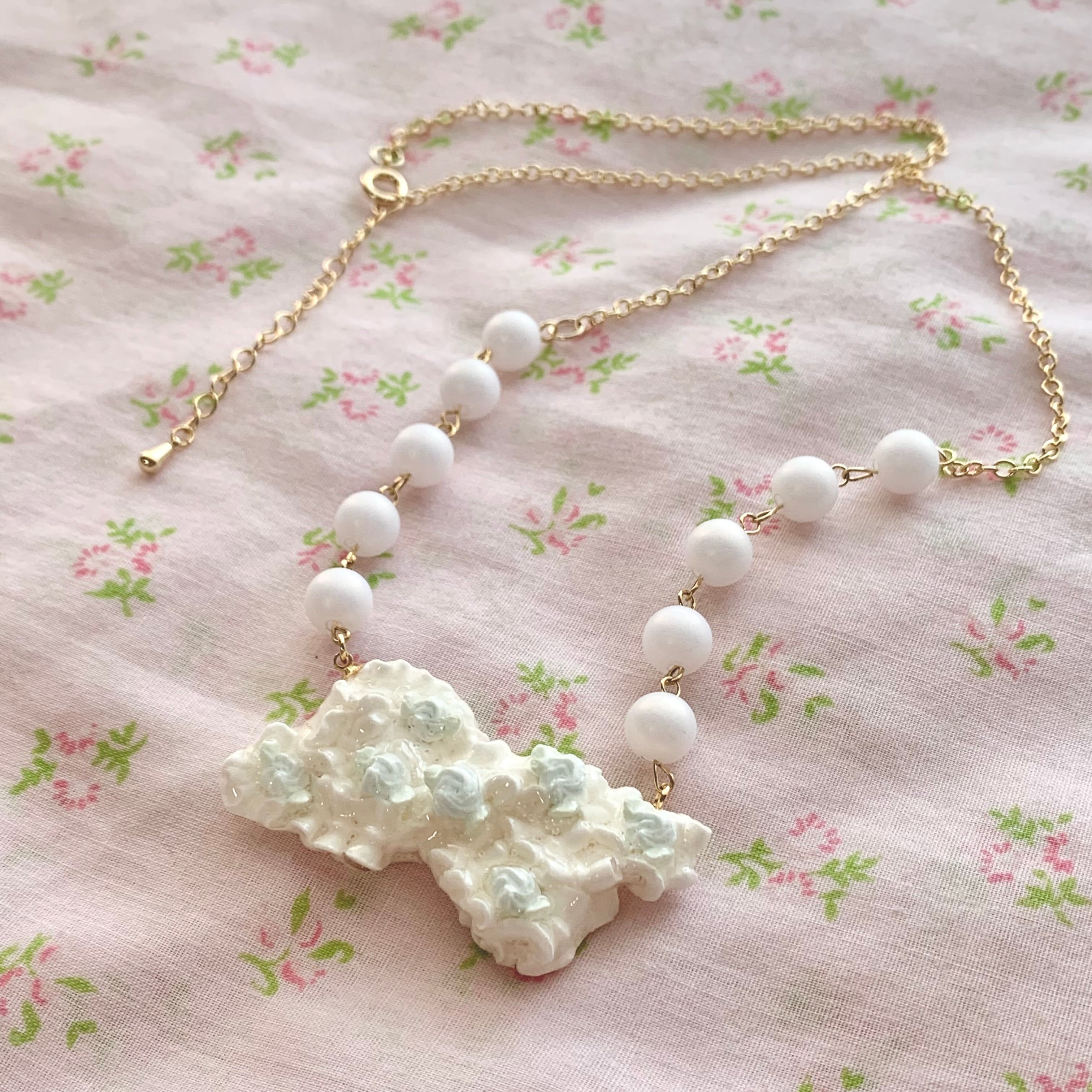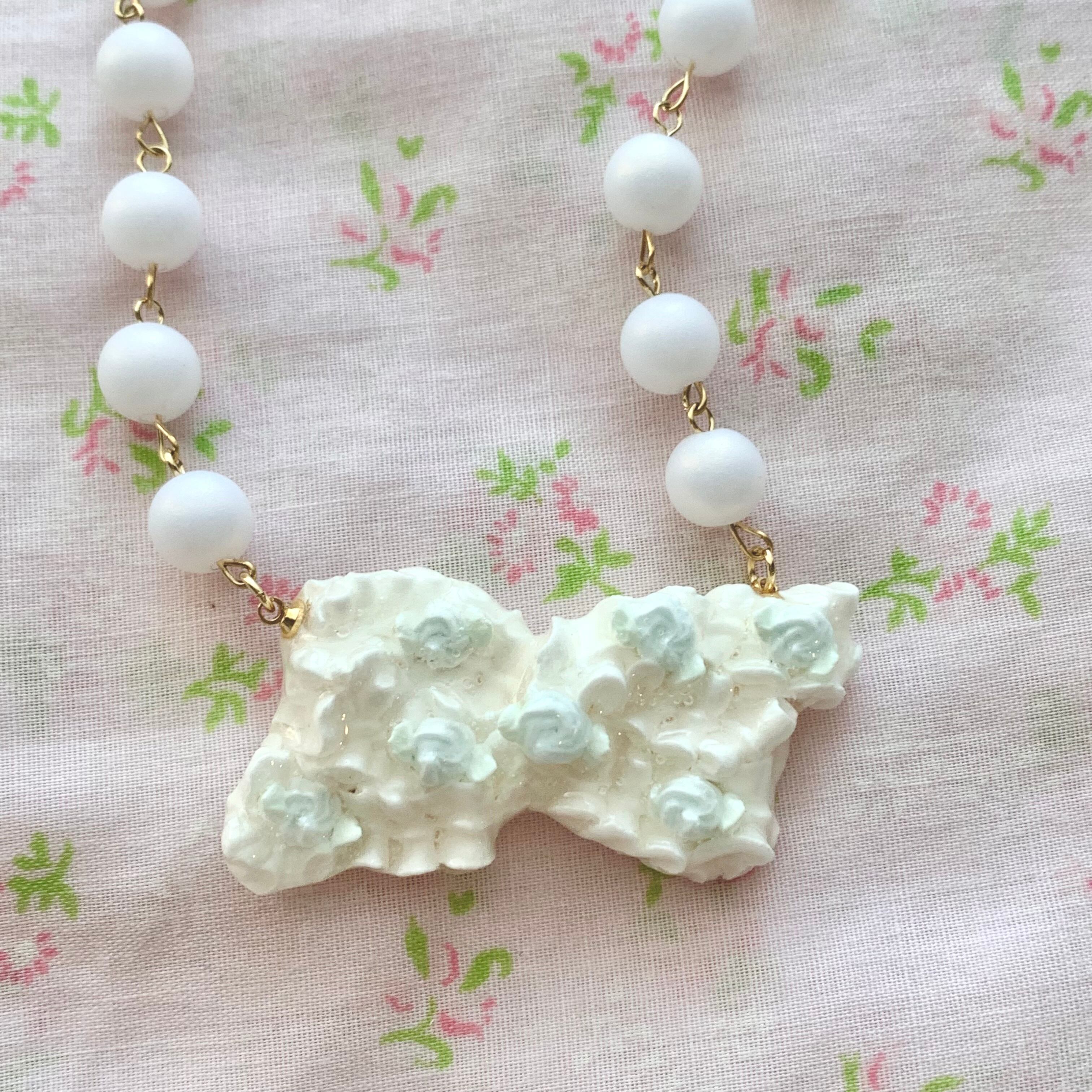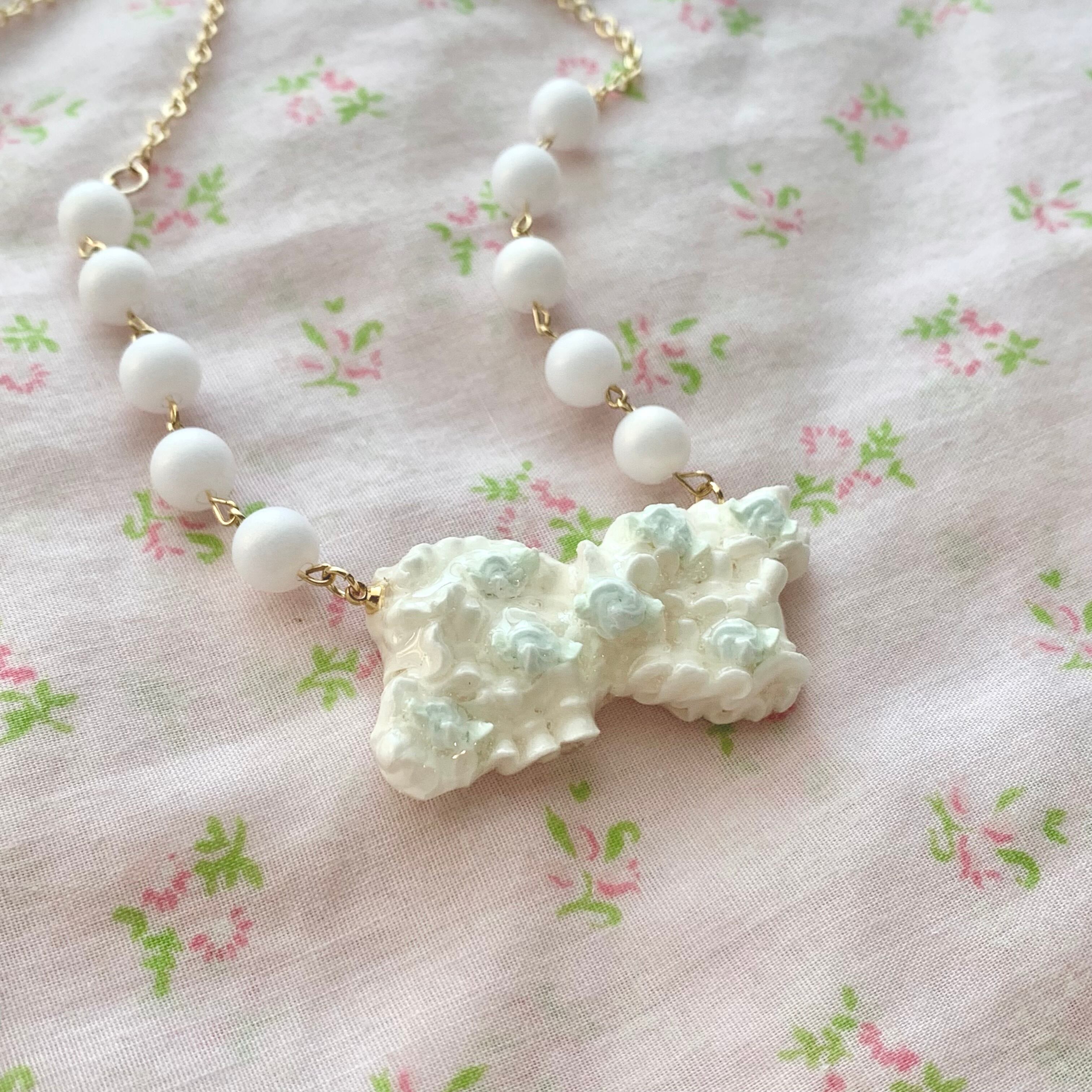ふりふりクリームのおりぼんにベビーブルーのローズが乗った可愛いネックレス