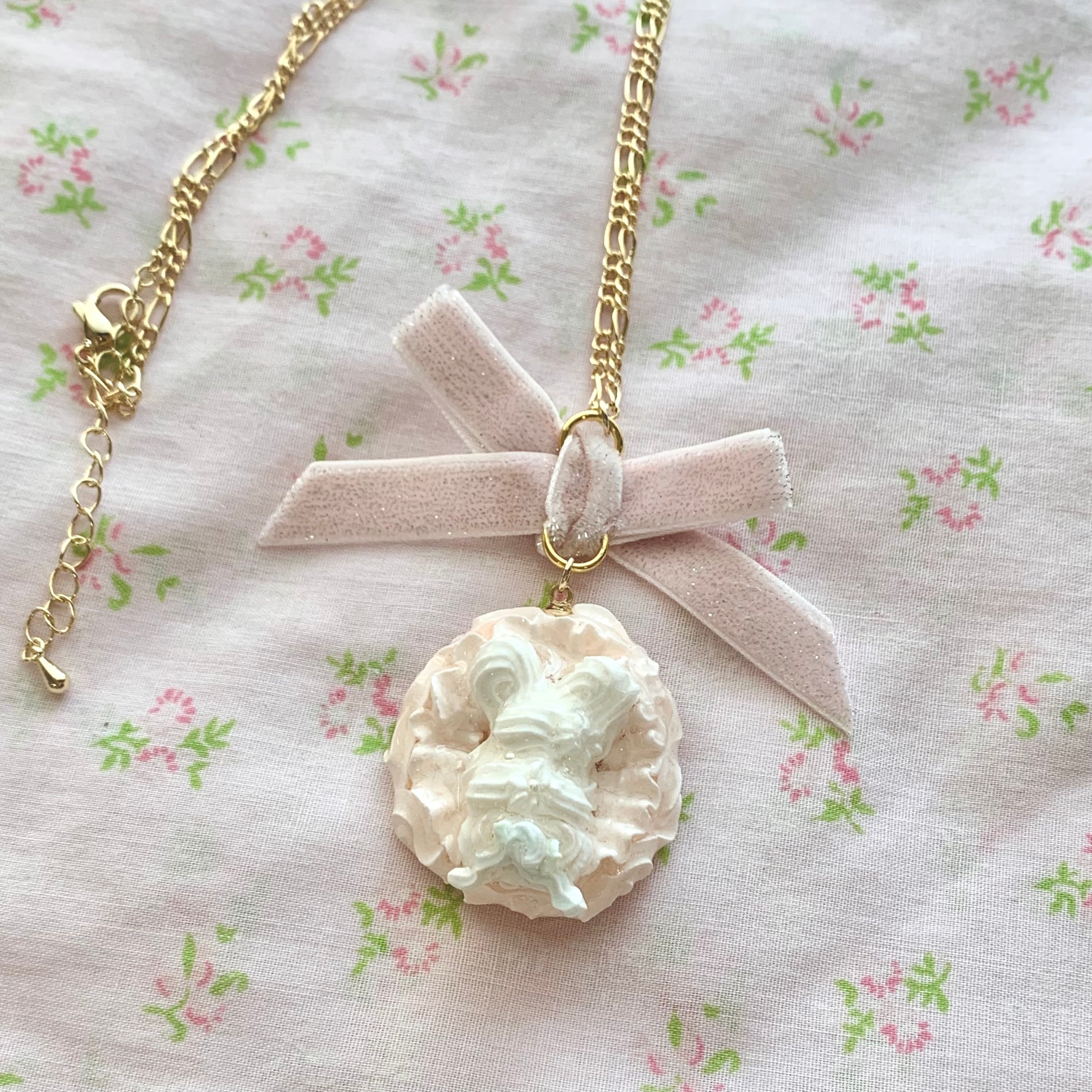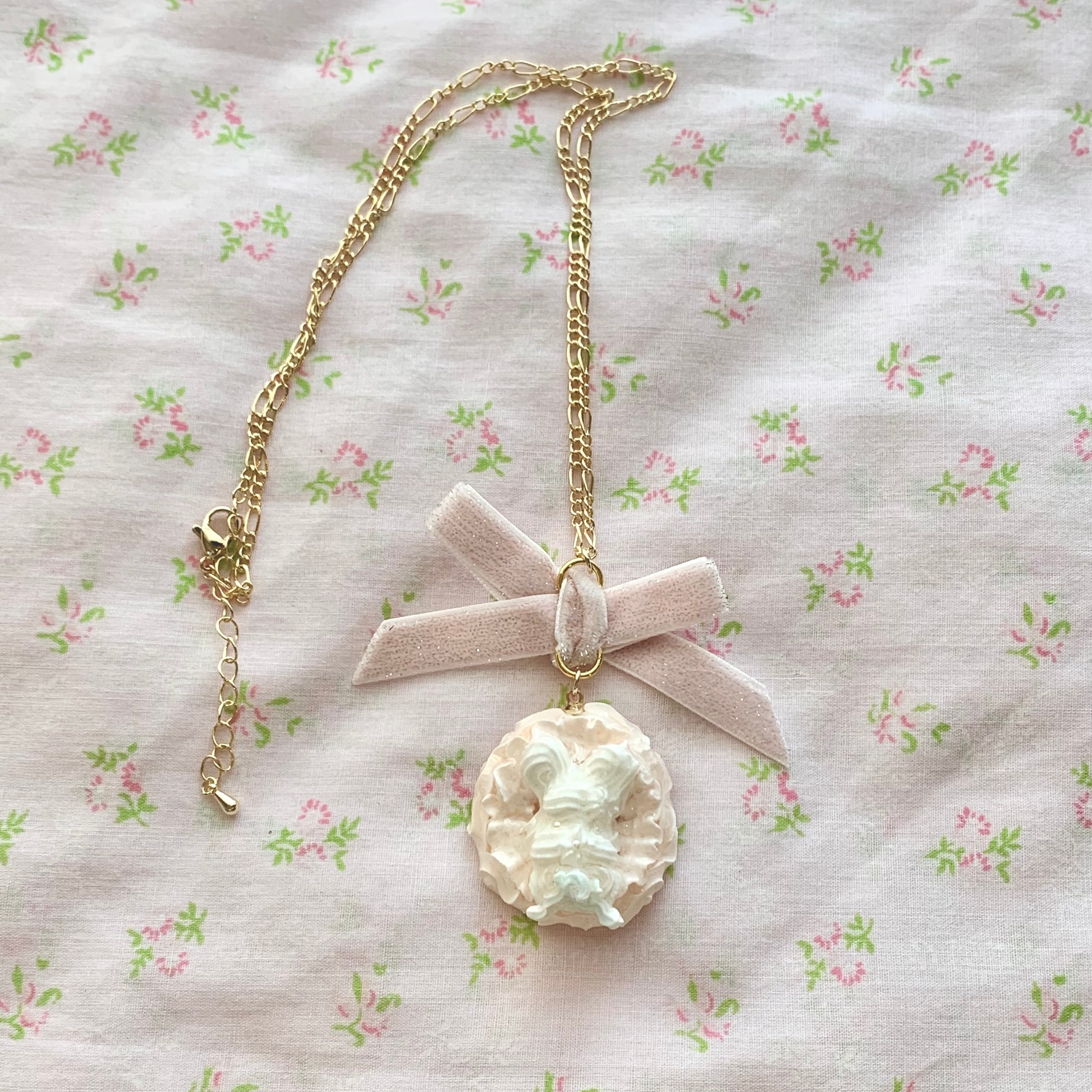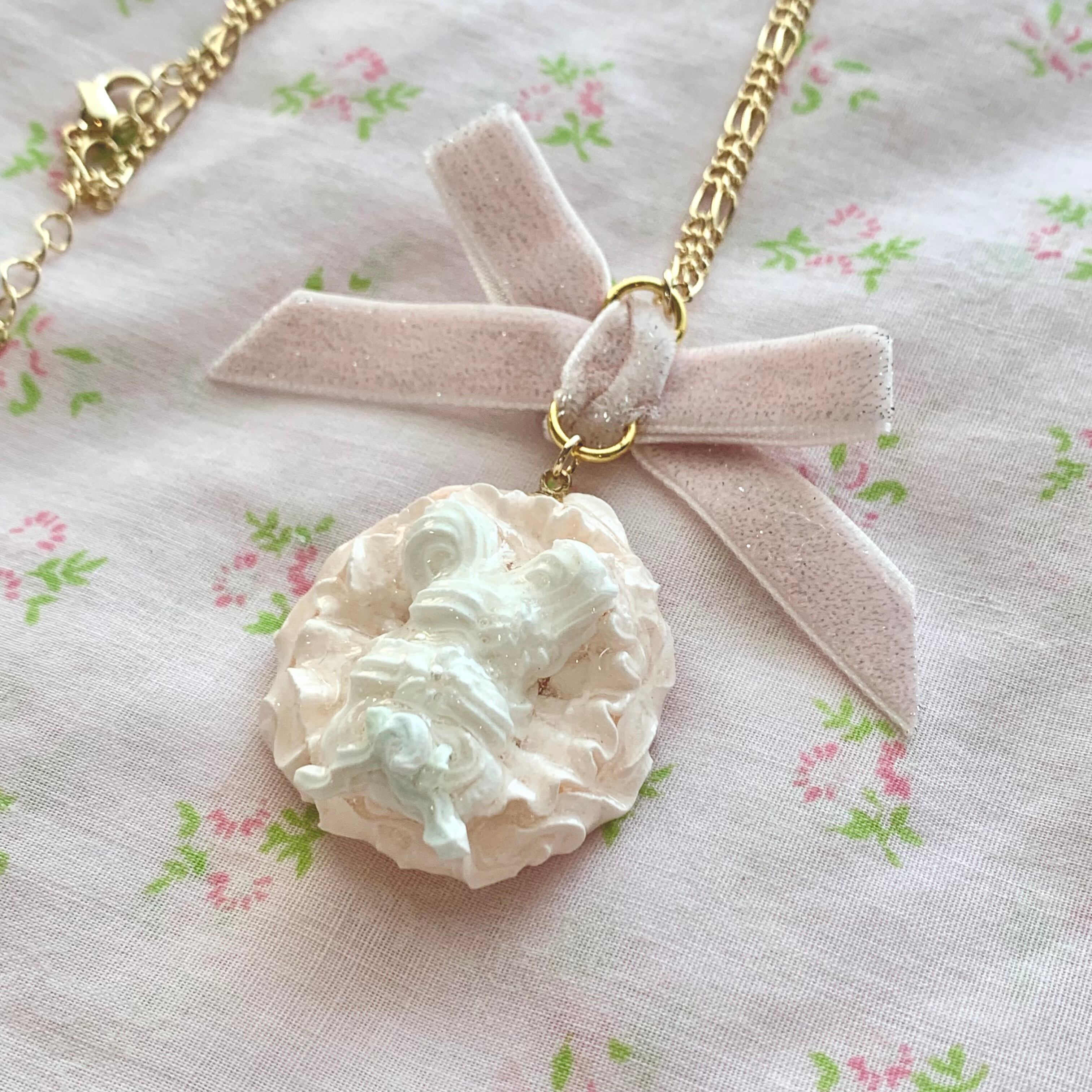 ふりふりしたピンククリームにうさちゃんがいる可愛いネックレス