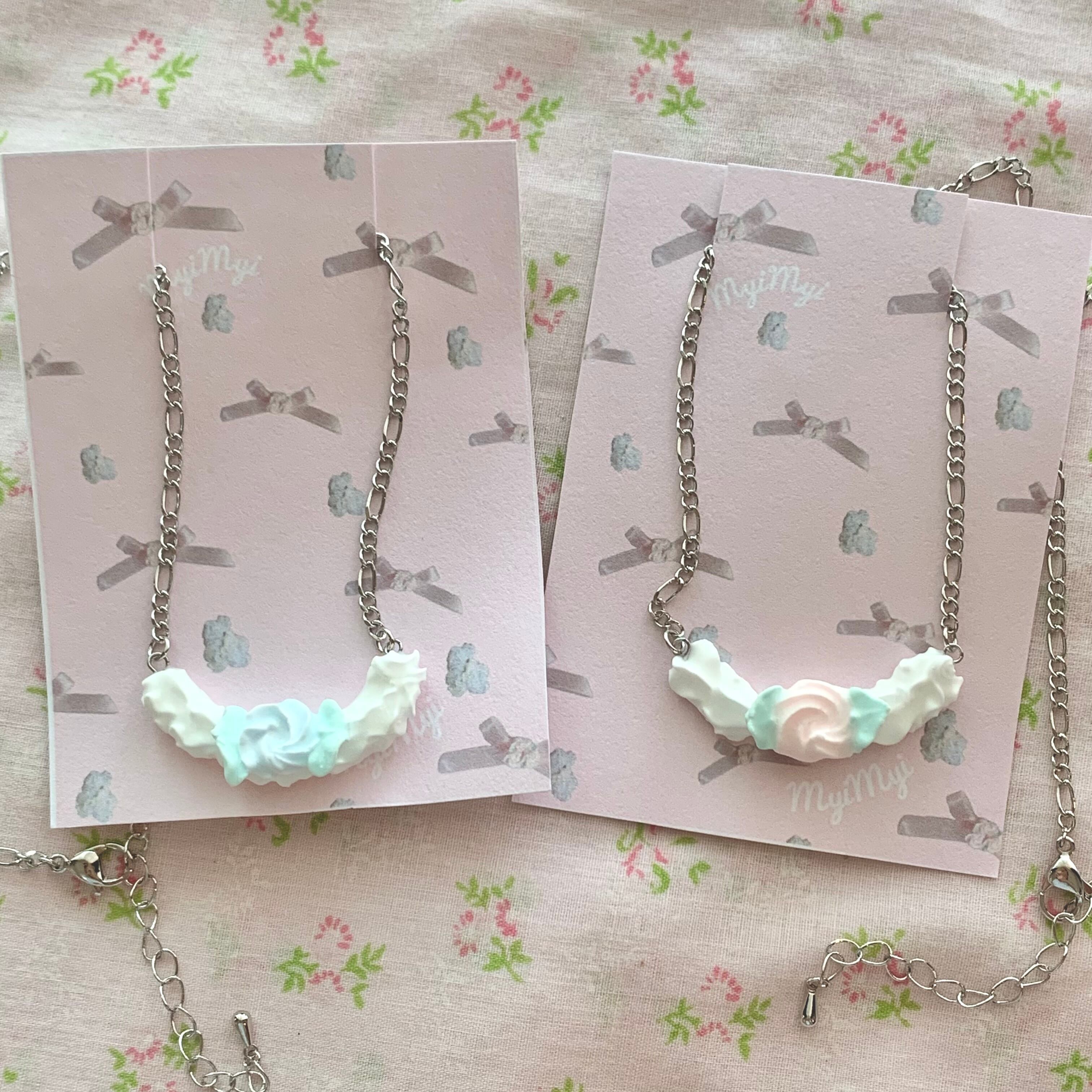 白いクリームにホイップのローズが乗った甘いデザインのネックレス