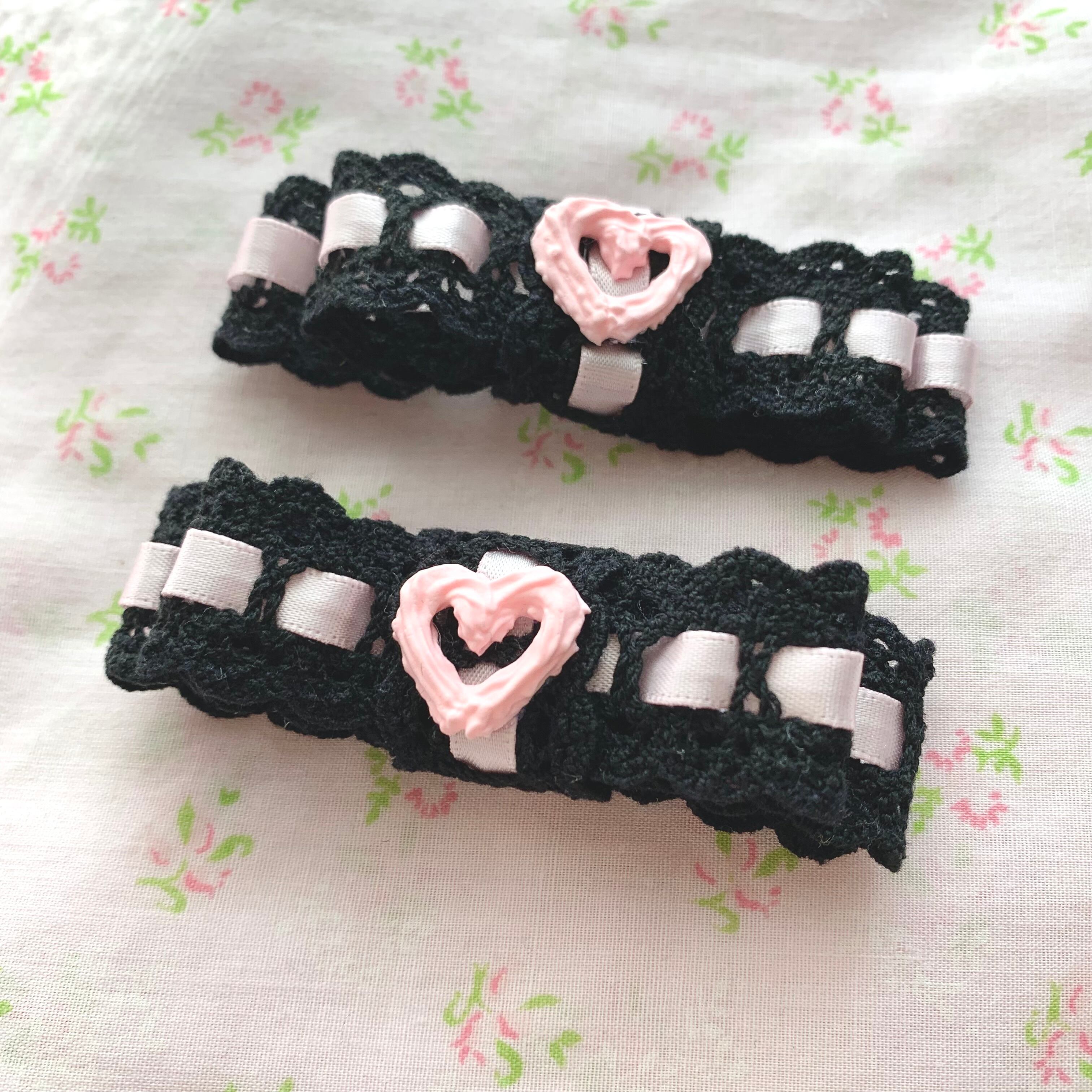 はしごレースツインリボン 黒×ピンクヘアクリップ